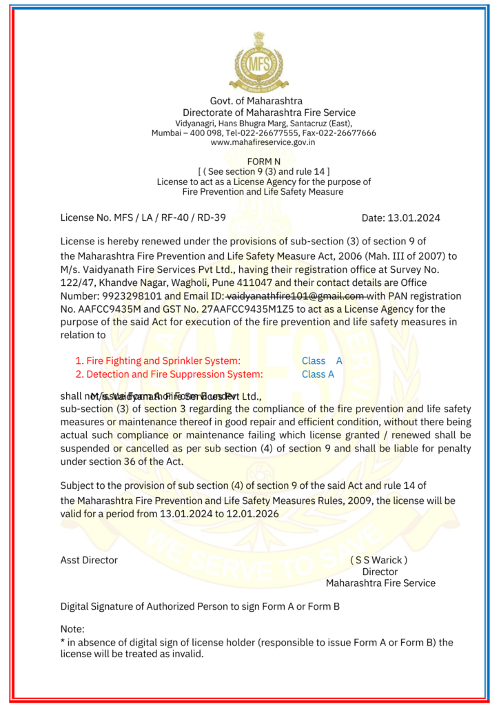 We are ‘A’ Class License holder to act as licensed agency for total solution under oner roof such as hydrants, sprinkler, And Also ‘A’ Class License holder for the Detection and Gas suppression system.